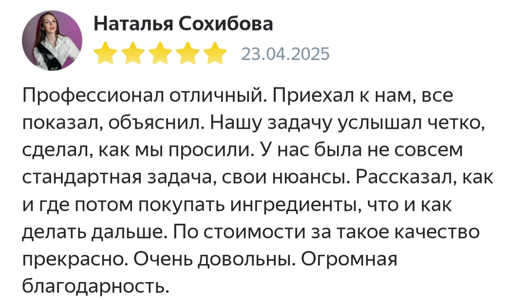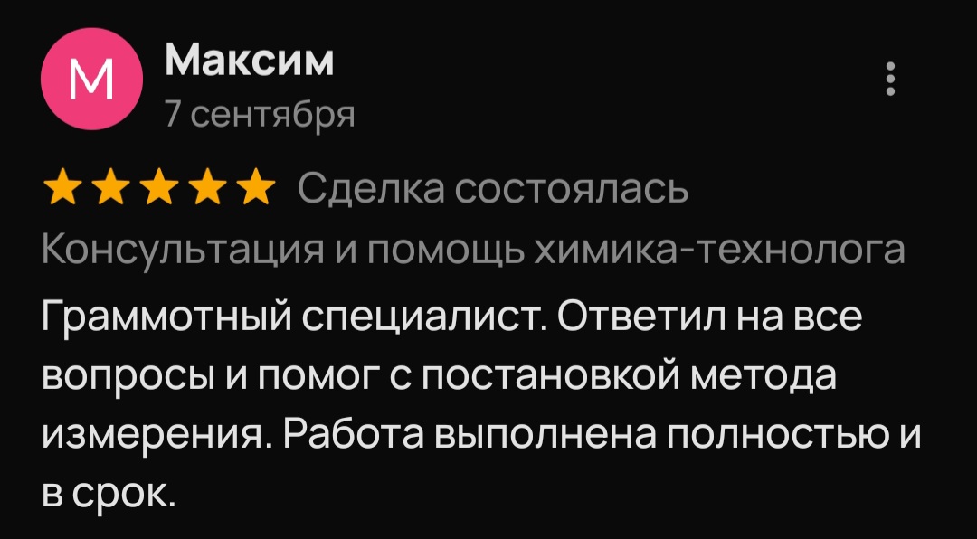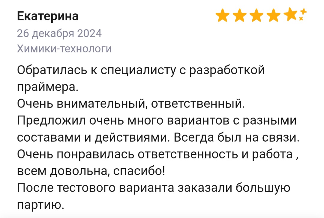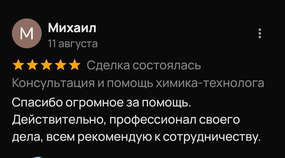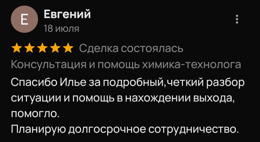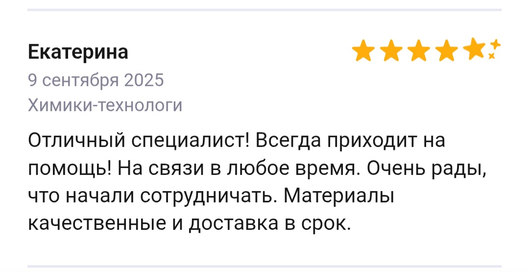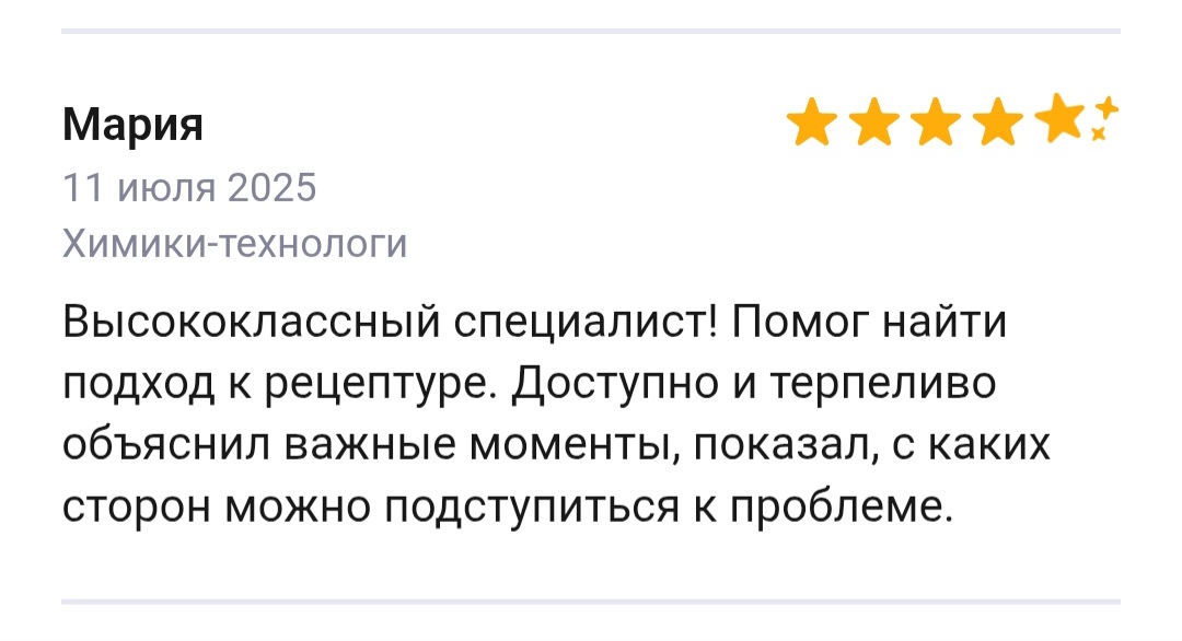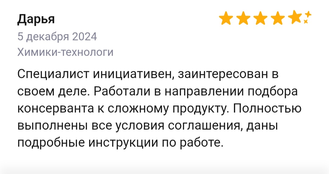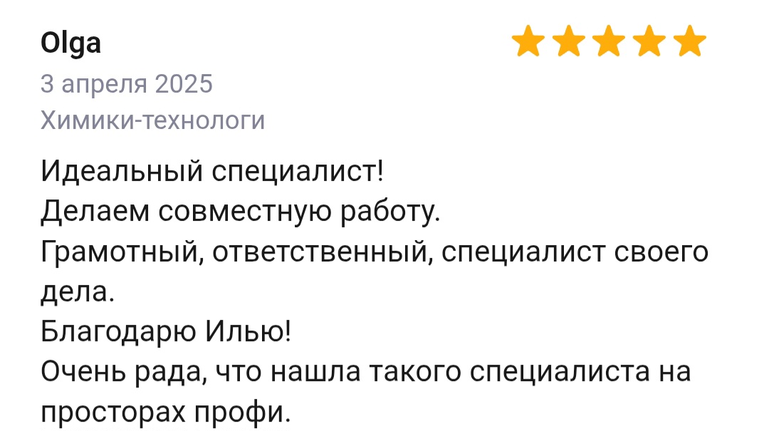 Меня зовут Илья Борисов, я специалист-химик, работаю с 2011 года. Имею огромный опыт, более 200 успешно решенных химических задач в бизнесе. При обращении ко мне вы можете быть уверены, что получите именно те анализ, данные и рецептуру, на которые рассчитывали.
